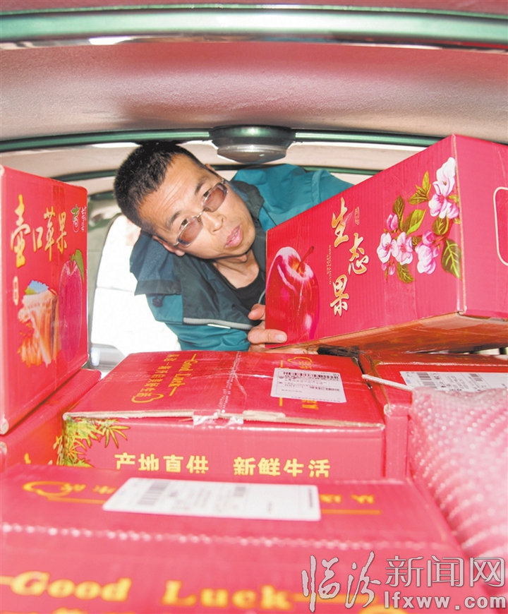 图①为工作人员正在往快递车上装苹果。