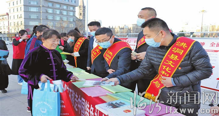 临汾新闻网讯 12月3日,洪洞县文化和旅游局在县城中心广场开展“12·4”国家宪法日法治宣传活动。图为工作人员在向来往群众发放宣传手册、宣讲宪法法律知识。 (狐一民 卢高杰 摄影报道)