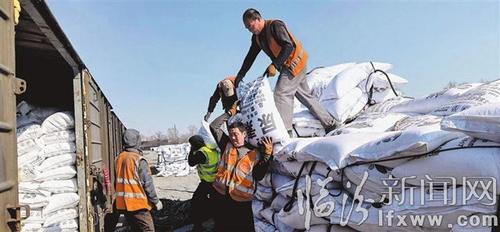 临汾新闻网讯 当前正值春耕追肥时节,中国铁路太原局集团公司侯马车务段为保证春耕化肥尽快运到田间地头,集中人力优先装运春耕物资,并开辟绿色通道,助力春耕物资快速运输。图为近日,侯马北站工人们正在加班加点装运化肥,准备发往成都、武汉、南宁等地,保障当地春耕用肥。