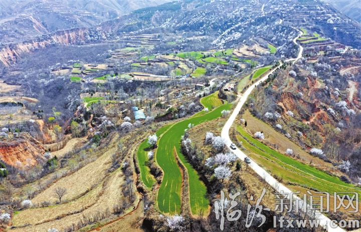 临汾新闻网讯 阳春三月,襄汾县大邓乡陕家坡村山桃花竞相开放,一簇簇美丽的山桃花点缀山野,洁白如雪,美不胜收,与山间梯田、道路、村庄相映成趣,组成了一幅春意盎然的大自然画卷。