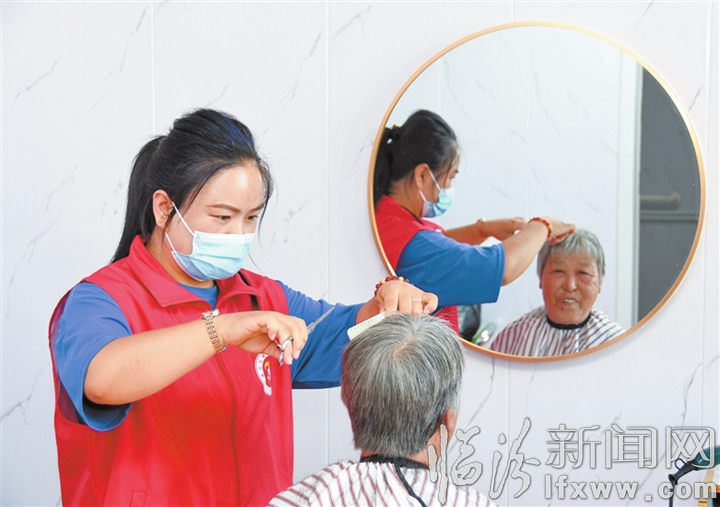 临汾新闻网讯 蒲县黎掌村公共浴室建成以来,免费为全村60岁以上老年人提供洗浴、洗衣和理发服务,极大地提升了村民的幸福感。图为理发师在为老人理发。