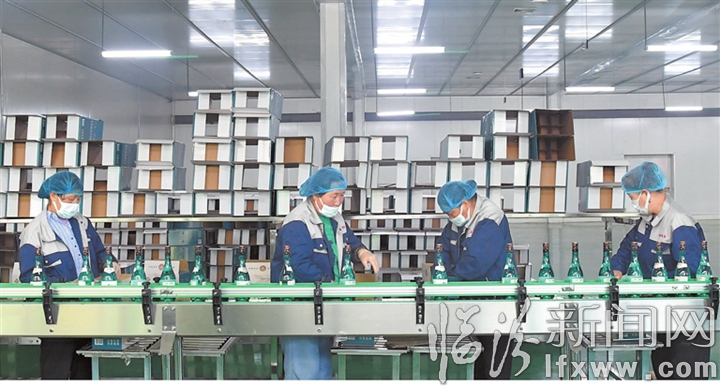 临汾新闻网讯 大宁县昕宗酒业有限公司是一家集制曲、酿造、蒸馏、销售为一体的综合性酿酒企业。该企业年产2万吨白酒一期项目已于2021年投产,二期项目计划于2024年前建成,届时将再扩大产能5000吨,提供就业岗位300余个,为当地全方位推动高质量发展注入新动能。图为工人正在流水线上作业。
