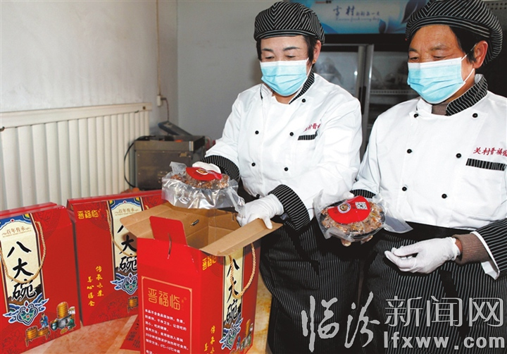 临汾新闻网讯 近日,在襄汾县古城镇关村,村民对制作完成的传统美食“八大碗”进行装箱销售。