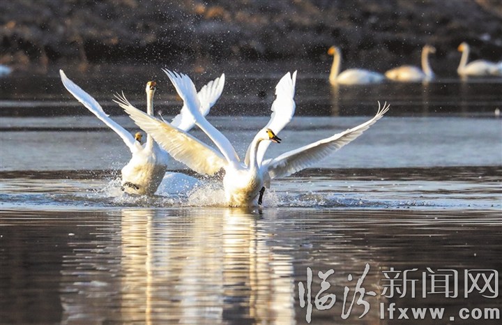 临汾新闻网讯 12月15日,在洪洞县汾河国家湿地公园,白天鹅在水中游弋嬉戏。