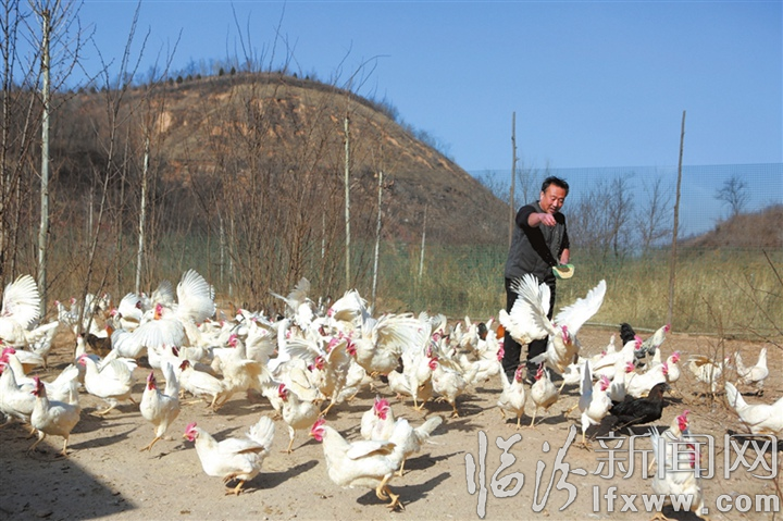 图为农庄负责人正在喂食散养的1000只走地鸡。