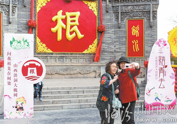 临汾新闻网讯 大地回暖,春光正好,洪洞大槐树寻根祭祖园景区迎来游客高峰,来自全国各地的游客体验寻根祭祖文化,探寻祖先迁徙故事,感受“到了临汾咱是回家”的热情。图为3月30日,游客在“根”字影壁前拍照留念。
