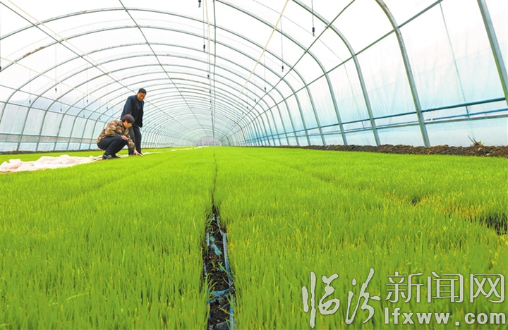临汾新闻网讯 近日,在安泽县和川镇和川村水稻大棚育苗基地里,工作人员在对水稻苗的生长情况进行查看。据了解,该基地占地4亩,建有2座大棚,育苗可满足1000亩水田种植需求。