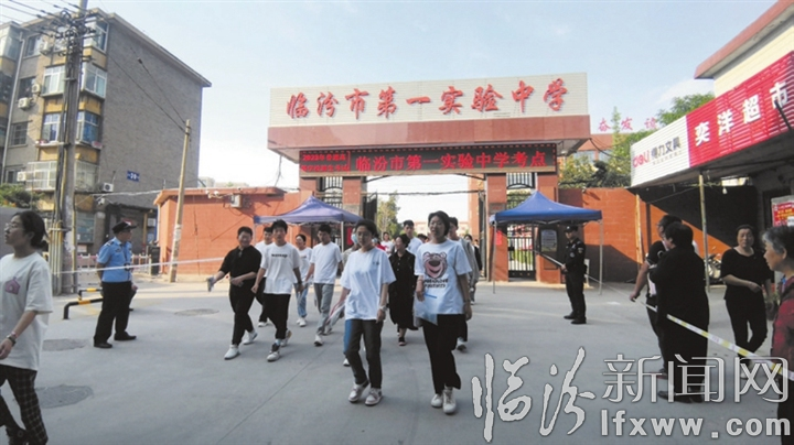 临汾市第一实验学校考点,考生结束下午考试走出考场。