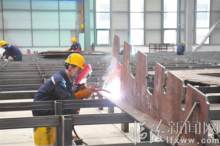临汾新闻网讯 山西中部智造科技有限公司是一家集设计、加工、制造、销售、施工为一体的装配式智能化制造企业。该公司主要生产PS构件、桥梁钢箱梁、风力发电塔筒、密闭运输金属管道、太阳能光伏板组件分布式、集中式支架等设备,每年可生产光伏组件、风筒等各类构件8万吨,年产值10亿元。图为该公司工人正在焊接桥梁钢箱梁。