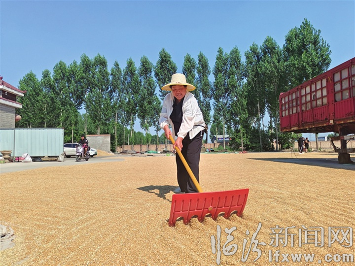 临汾新闻网讯 6月14日,尧都区金殿镇伍级村村民潘雪丽家的3.5亩小麦喜获丰收,她正在家门口晾晒新收获的小麦。