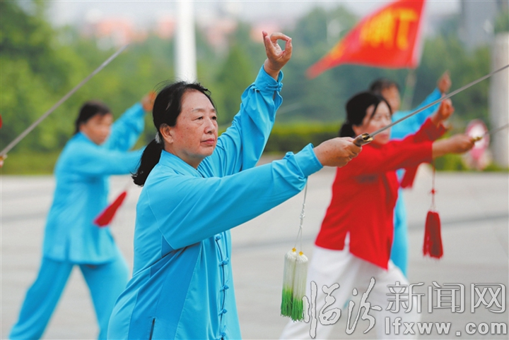 临汾新闻网讯 6月29日,太极拳爱好者在襄汾县丁陶文化广场表演。“七一”临近,襄汾县举行了庆“七一”杨式拳展演活动,全县50余名太极拳爱好者统一着装,通过表演太极拳、太极剑、太极扇、太极棍等,弘扬中华优秀传统文化,喜迎“七一”建党节的到来。