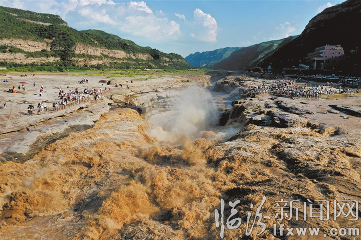 临汾新闻网讯 近日,游客在吉县黄河壶口瀑布旅游区游览观瀑。受黄河干流晋陕峡谷强降雨天气影响,吉县壶口瀑布水量增加,河水颜色由清变浊,再现“大河流金”景观,吸引了众多游客。