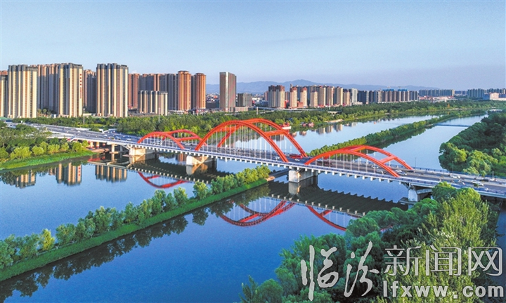 临汾新闻网讯 7月11日,市区彩虹桥和城市建筑的倒影与汾河生态文化景区相映成趣。盛夏时节,汾河两岸绿意盎然,层次丰富的园林景观宛如一幅现代艺术感的水天画卷,让人流连忘返。