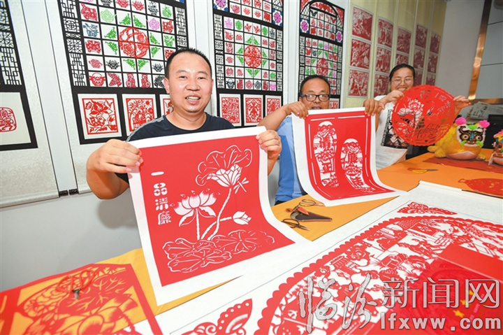 临汾新闻网讯 8月1日,在浮山县剪纸传习基地张宁剪纸艺术馆,张宁团队在展示清廉文化剪纸作品。该基地立足“中国剪纸之乡”的非遗传统文化底蕴,以及本土文化资源和人才优势,加强廉洁题材作品创作,着力打造集思想性、艺术性和观赏性于一体的优秀廉洁文化艺术精品,推动浮山县廉洁文化阵地建设。