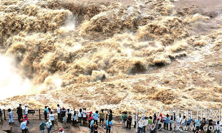 临汾新闻网讯 9月8日,游客在吉县黄河壶口瀑布游览观瀑。近日,受上游降雨和万家寨水库调节放水影响,黄河干流迎来秋汛,每秒流量超过1000立方米,壶口瀑布主副瀑布连成一线,滚滚黄河水奔腾而下,吸引众多游客驻足观看。