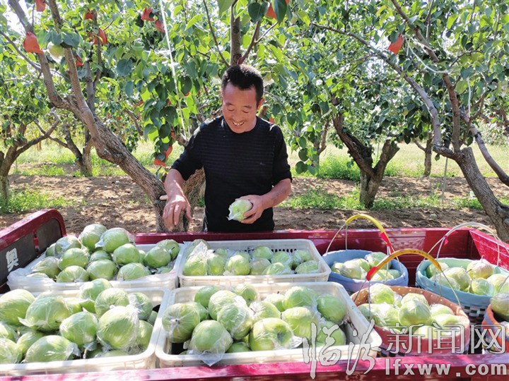 临汾新闻网讯 9月16日,2023年隰县玉露香梨采摘季活动开幕。梨园内,一颗颗玉露香梨高挂枝头,散发着浓浓果香,令人垂涎欲滴,吸引了众多外地客商和当地群众前来采摘。图为在隰县龙泉镇上留村智慧果园示范基地,农户将新摘的玉露香梨进行装筐发货。