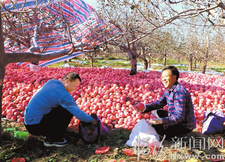 临汾新闻网讯 金秋时节,吉县吉昌镇宏聚村果农张恩耀种植的12亩红富士苹果喜获丰收。图为张恩耀(右)正在果园分拣苹果。