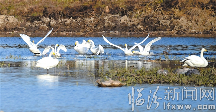 临汾新闻网讯 11月12日,在洪洞汾河国家湿地公园,白天鹅在河水里嬉戏。随着候鸟迁徙季节的到来,数百只南迁的白天鹅相继回到了洪洞汾河国家湿地公园,这群“白精灵”或嬉戏捕食、或引吭高歌、或翩翩起舞,为秀美汾河增添了无限生机与活力。