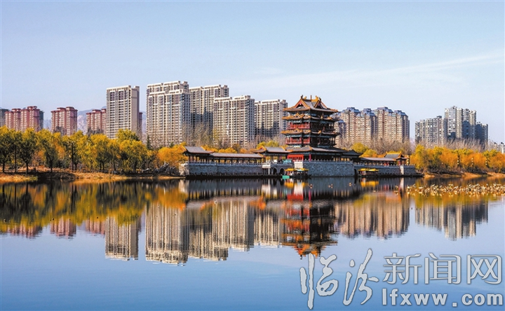 临汾新闻网讯 初冬时节,市汾河文化生态景区景色宜人,和煦的阳光与湛蓝的天空、碧绿的河水、斑斓的植被交织在一起,勾勒出一幅宁静美丽的生态画卷。图为11月28日拍摄的汾河文化生态景区萱楼。