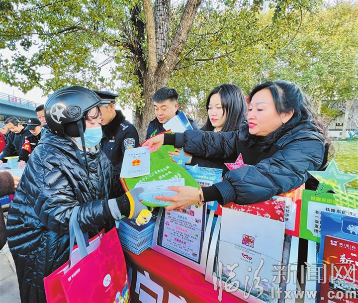 临汾新闻网讯 日前,尧都区铁路东办事处、铁路东派出所、铁路东司法所、三元社区、山西尧城律师事务所、山西映连红党支部联合辖区共驻共建单位开展“12·4”国家宪法日暨“宪法宣传周”活动,引导居民群众学法、知法、守法、用法。图为工作人员为居民发放宣传资料并讲解法律知识。