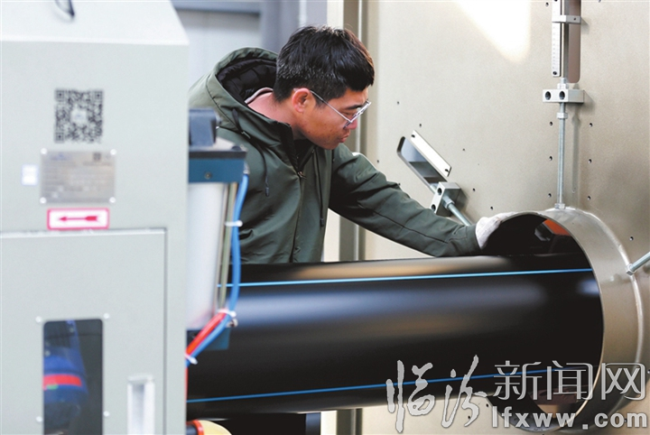 临汾新闻网讯 1月11日,在山西润农新材生态科技有限公司内,工人在生产新型管材。山西润农新材生态科技有限公司位于襄汾经济技术开发区高端装备制造产业园,专门从事节水灌溉装备、市政给排水管道的研发、生产、销售。该企业以自主创新、科技赋能为支撑,采用新材料、新技术、新工艺、新设备生产喷滴灌管材、PVC管材、PE管材以及市政给排水管材等系列产品,产品销往省内外多地,深受市场青睐。