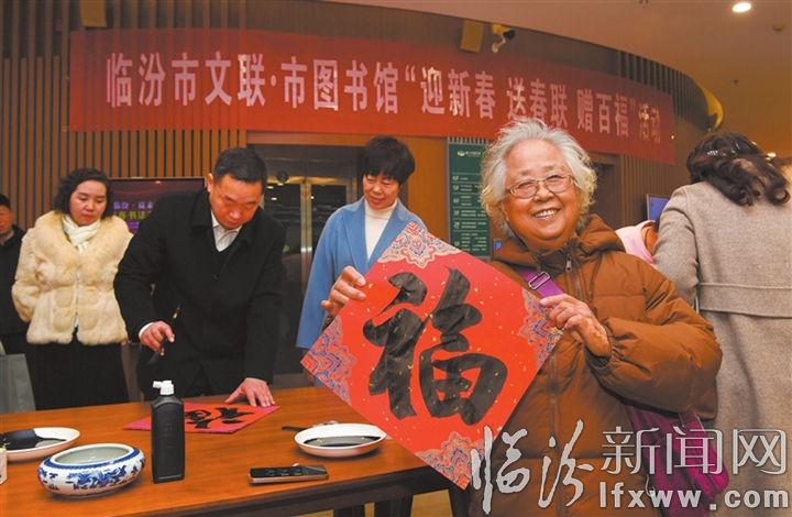 临汾新闻网讯 近日,市文联与市图书馆共同举办了“迎新春 送春联 赠百福”活动,来自市书法家协会的20多名知名书法家挥毫泼墨,为到馆的读者与闻讯而来的群众书写吉祥喜庆的福字和春联。