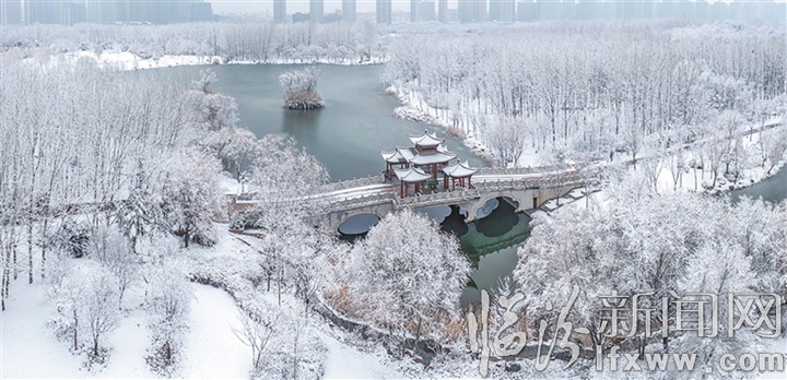 临汾新闻网讯 1月31日晚,我市迎来大范围降雪天气,一场降雪过后,大地万物银装素裹,美不胜收。图为2月1日,航拍镜头下的市汾河文化生态景区。