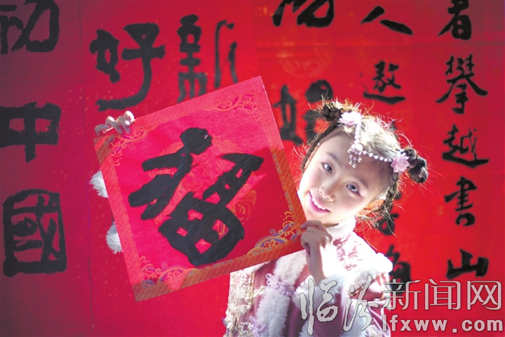 临汾新闻网讯 春节临近,一名小朋友在襄汾县图书馆展示书写的福字,迎接新春的到来。