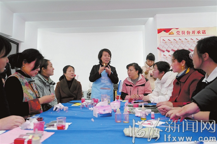 临汾新闻网讯 3月8日,尧都区水塔街道阳光社区组织开展了“爱在妇女节 最美半边天”三八节手工制作活动。图为工作人员教授妇女们制作精美口红。