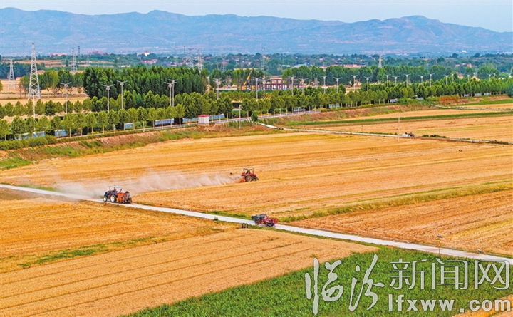 临汾新闻网讯 6月10日,农机手驾驶农机在襄汾县邓庄镇燕村的农田里抢收小麦、复播玉米。
