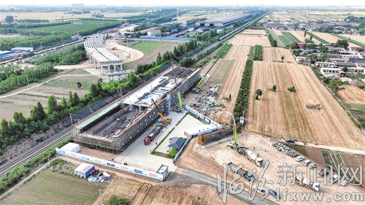 临汾新闻网讯 6月14日,在襄汾县国道108线过境改线工程南同蒲铁路跨线转体立交桥建设现场,工人们正加紧施工作业。