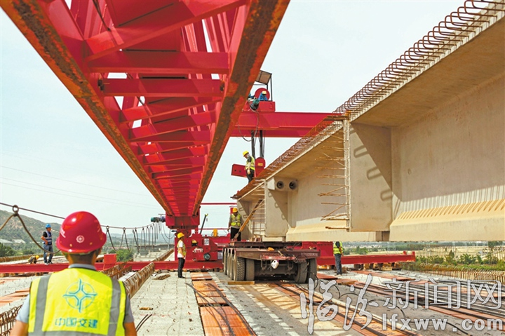 临汾新闻网讯 近日,在侯马市程村跨线桥施工现场,工人们正进行T梁架设作业。