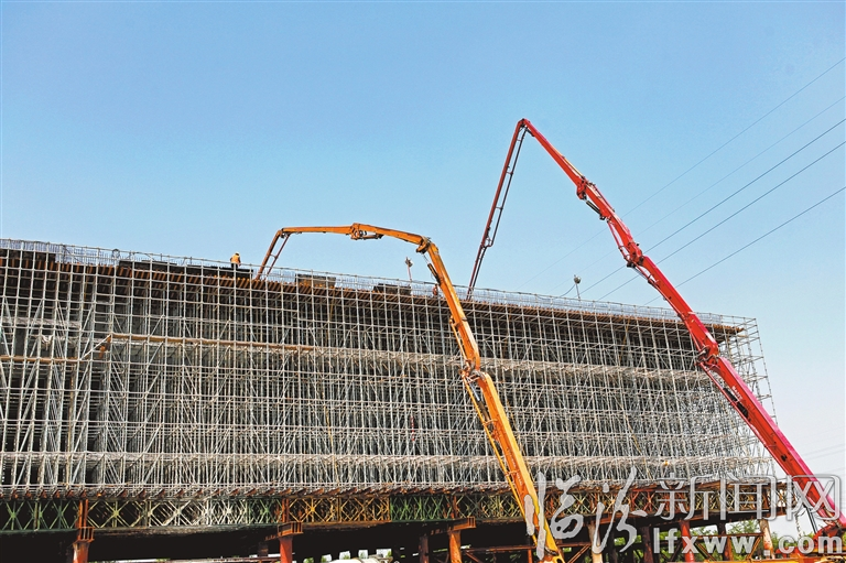 临汾新闻网讯 近日,在侯马市程村南同蒲铁路跨线桥建设工地,工人们正进行转体桥梁混凝土浇筑作业。程村上跨南同蒲铁路转体桥是国道108项目关键控制性节点工程,目前桥梁建设已取得阶段性进展。