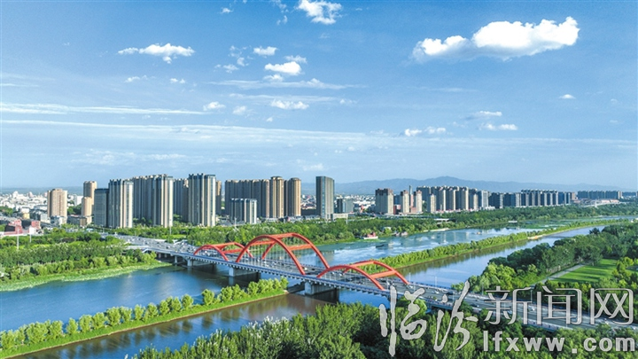 8月22日,航拍镜头下的临汾市汾河文化生态景区,蓝天如洗,碧水悠悠,天空中飘过的朵朵白云,与城市、桥梁、绿植交相辉映,构成一幅美丽的生态画卷。