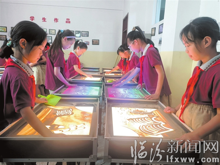 近年来,市第二小学认真落实立德树人根本任务,深入实施素质教育,培养学生兴趣爱好,提升综合素养,促进学生全面发展。图为该校学生在课堂上绘制沙画。