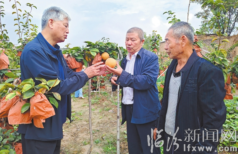 临汾新闻网讯 金秋时节,洪洞县赵城镇永乐村村民家的庭院里处处可见挂满枝头的富硒冬梨。近年来,该村积极盘活村民庭院空地,大力发展特色庭院经济,以庭院“小经济”带动群众“大增收”。图为农业专家正在为村民讲授富硒冬梨后期生长管护知识。