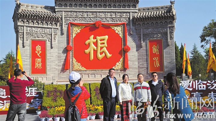 10月23日,游客在洪洞大槐树景区“根”字影壁前拍照留念。金秋十月,天高云淡,很多游客在这个季节选择错峰出游,当地旅游热度不减。