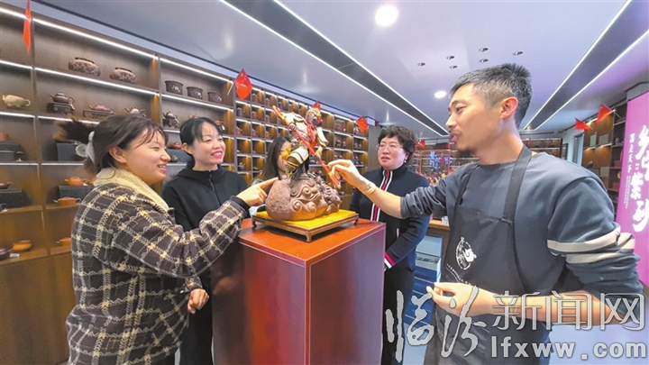 临汾新闻网讯 近日,乡宁县景韵鸿鹄紫砂工艺有限公司制作的文创产品黑悟空紫砂泥塑新鲜出炉,其人物雕工细腻、神态传神、栩栩如生,受到游客频频点赞。图为11月7日,工艺师在向游客介绍作品。