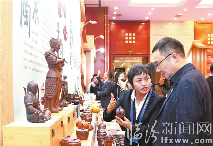 临汾新闻网讯 11月28日,山西省在杭州举办以“‘浙’里遇见晋善晋美”为主题的“山西之夜”,翼城花鼓、乡宁紫砂等特色传统非遗、名优特产亮相展区,吸引了众多客商关注。图为工作人员在为客商介绍乡宁紫砂产品。