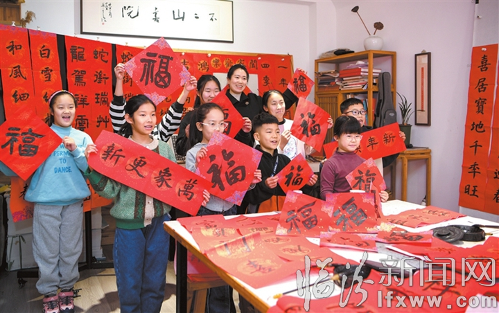 临汾新闻网讯 近日,临汾市山山艺术学校举办了“写好中国字、春联送祝福”迎新春主题活动,孩子们在老师的指导下,铺纸、蘸墨、下笔……凝神聚气、挥毫泼墨,书写春联和“福”字,共同迎接新春佳节的到来。图为孩子们在展示自己书写的春联和“福”字。