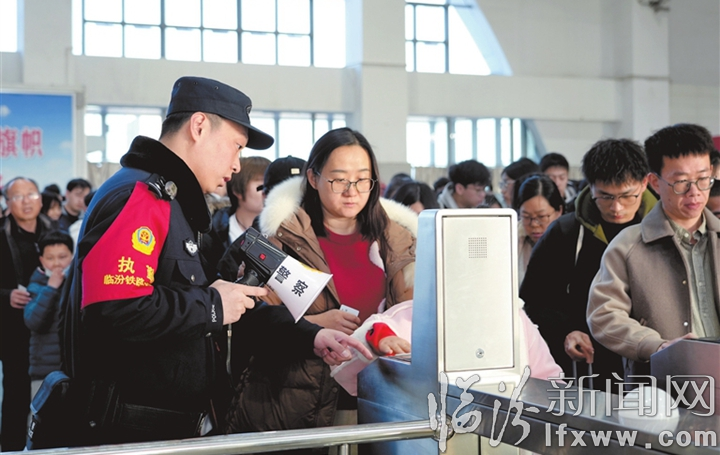 临汾新闻网讯 随着春节假期的结束,临汾西站迎来返程客流高峰,该站派出所科学调配警力,加大车站巡逻检查,强化秩序维护,全力保证客流高峰平稳有序。图为近日执勤民警在维持站内秩序。