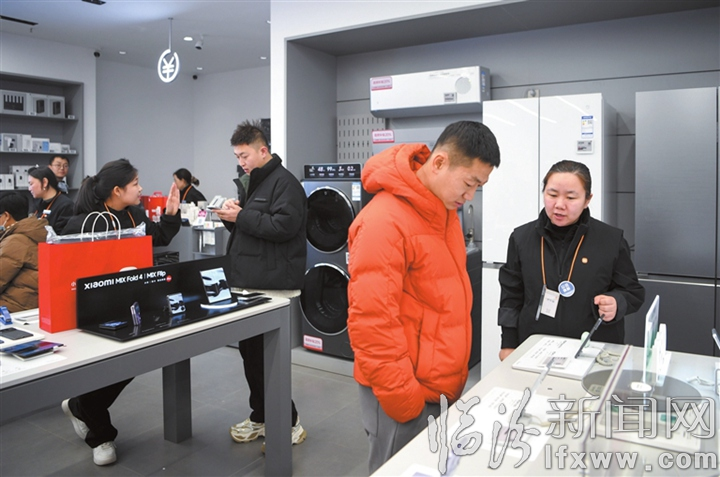 临汾新闻网讯 2月19日,在市区一家商场的电子产品专柜,消费者正在选购智能手机。随着全省手机、平板、智能手表手环等数码产品开启购新补贴,线上平台“热度飙升”,线下门店“热气腾腾”。商家开展了丰富多彩的促销活动,进一步激发了群众的消费热情。