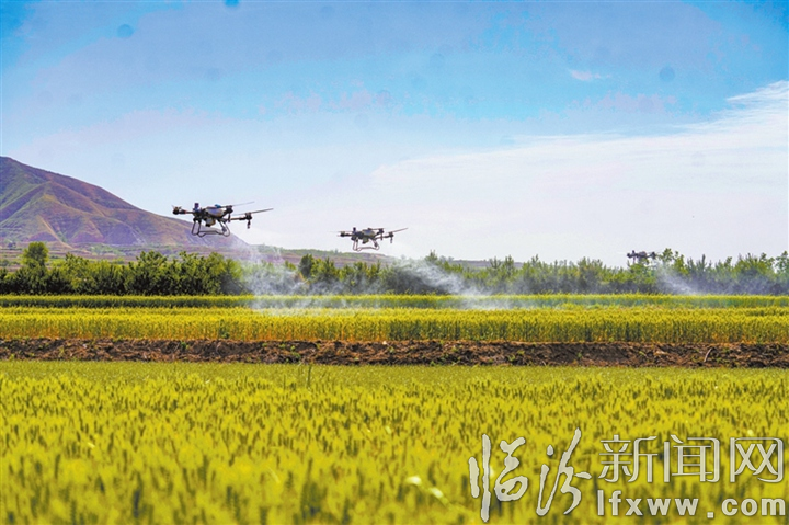 临汾新闻网讯 连日来,我市农业部门积极开展“一喷三防”作业,引导广大农民做好干热风天气防范应对工作,确保夏粮丰产丰收。图为5月17日,尧都区贾得乡农民使用无人机进行“一喷三防”作业,提高小麦植株抗干旱、抗干热风能力。