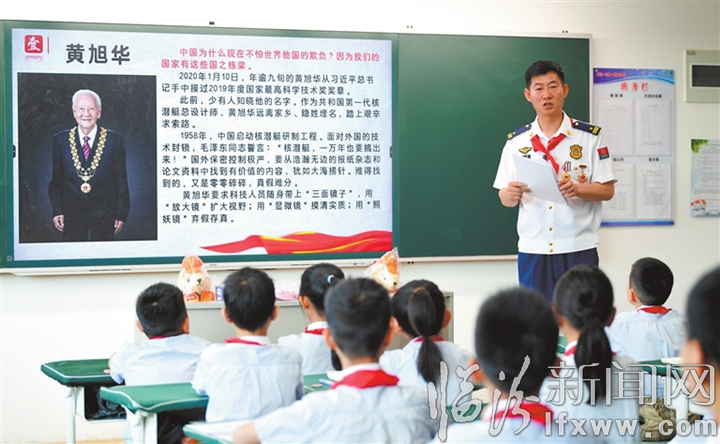 临汾新闻网讯 “六一”国际儿童节前夕,在临汾一中第一附属学校,该校校外辅导员、尧都区消防救援大队专业技术干部史爱福给同学们上了一堂关于英雄模范人物事迹的思政课,旨在让孩子们树立正确“三观”,走好人生每一步。图为5月29日,史爱福在给学生讲述“共和国勋章”、国家最高科学技术奖获得者黄旭华的事迹。