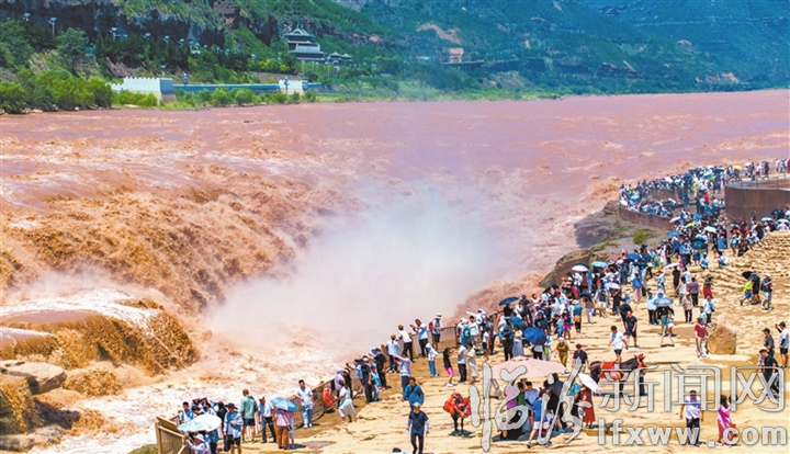 8月4日,游客在吉县黄河壶口瀑布景区观赏瀑布。连日来,受黄河上中游降雨影响,壶口瀑布水量大涨,形成主副瀑布连成一线的壮美景观。