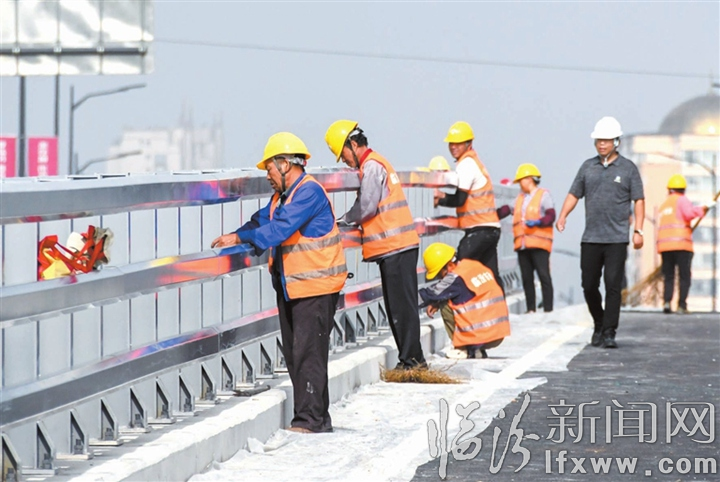 临汾新闻网讯 9月7日,我市快速中环北外环路“冷库段”节点,工人正在加固防护栏。连日来,该路段建设工地,项目方倒排工期、挂图作战,全力冲刺保障项目建设进度。截至目前,桥面沥青面层已铺设完成,正在进行中央分隔带护栏、交通标线施划、伸缩缝安装等收尾工作。