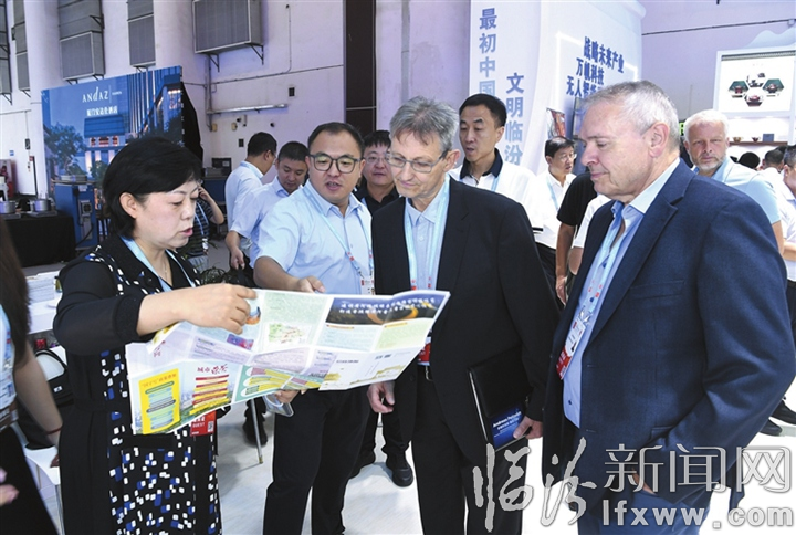 临汾新闻网讯 第二十五届中国国际投资贸易洽谈会吸引了众多海内外客商参与,不少客商纷纷借此机会前来找寻商机。图为9月10日,在临汾展区,市促投局负责人与来自德国的客商进行交流、沟通。