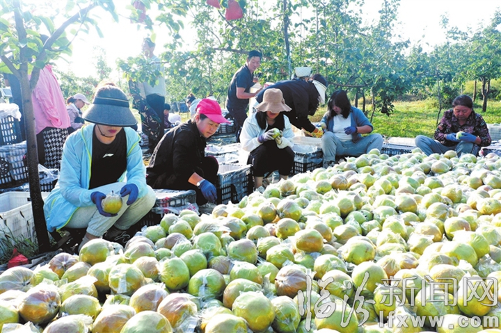 近期,隰县的23万亩玉露香梨喜获丰收,梨农们忙碌着分拣、包装刚收获的玉露香梨,一派繁忙景象。图为9月14日,该县龙泉镇卫家垣村梨农在分拣玉露香梨。