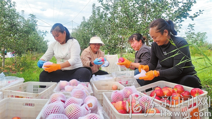 金秋时节,大宁县漫山遍野的宁脆苹果喜获丰收,处处可见正在采摘、分拣、装箱和运输苹果的果农。图为昕水镇白杜村村民正对采摘的苹果进行初步分拣。