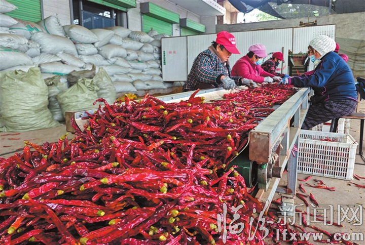 临汾新闻网讯 近年来,襄汾县赵康镇的辣椒产业已形成育苗、种植、烘烤、加工、销售为一体的产业链发展模式,有力带动当地农民增收、农业增效。图为11月7日,该镇赵雄村一家辣椒种植合作社的椒农在分拣辣椒。